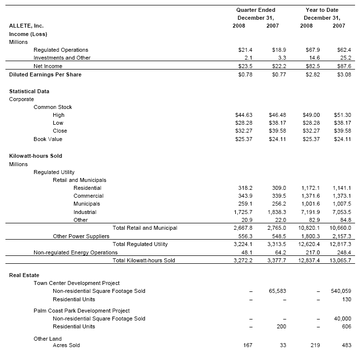 In the fourth quarter of 2008, ALLETE earned 78 cents per share - one cent more than the corresponding period in 2007. Net income was $23.5 million on operating revenue of $196.1 million in 2008. ALLETE recorded net income of $22.2 million on operating revenue of $212.3 million during the fourth quarter of 2007.