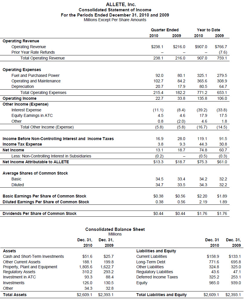 ALLETE, Inc. (NYSE:ALE) today reported 2010 earnings of $2.19 per share, a 16 percent increase over the $1.89 per share recorded in 2009. ALLETE's net income in 2010 was $75.3 million on total operating revenue of $907 million, compared to $61 million of net income and revenue of $759.1 million in 2009. Excluding a nonrecurring 12 cent charge as a result of the Patient Protection and Affordable Care Act, ALLETE's pro forma earnings were $2.31 per share in 2010. 2009 results included a 15 cent per share nonrecurring charge.