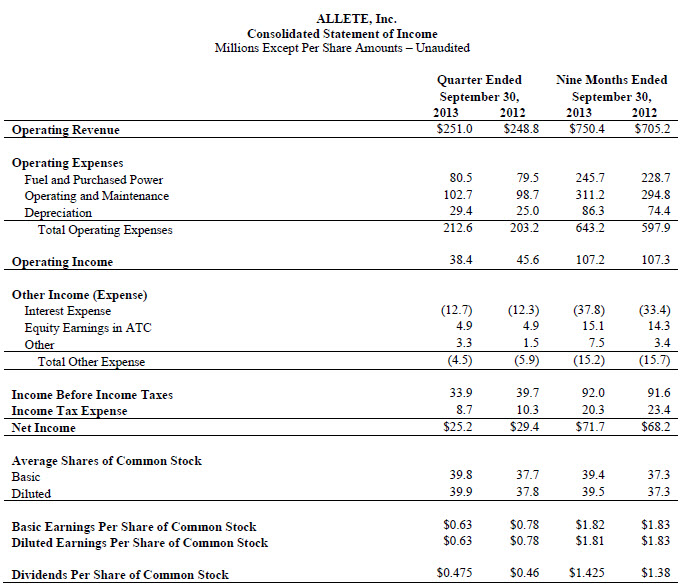 ALLETE, Inc. (NYSE:ALE) today reported third quarter 2013 earnings of 63 cents per share on net income of $25.2 million and revenue of $251 million, compared to earnings of 78 cents, net income of $29.4 million and revenue of $248.8 million in the third quarter a year ago.