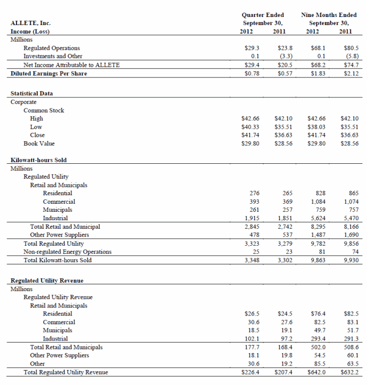 DULUTH, Minn. - ALLETE, Inc. (NYSE:ALE) today reported third quarter 2012 earnings of 78 cents per share on net income of $29.4 million and operating revenue of $248.8 million, compared to 57 cents on net income of $20.5 million and operating revenue of $226.9 million in the third quarter a year ago.