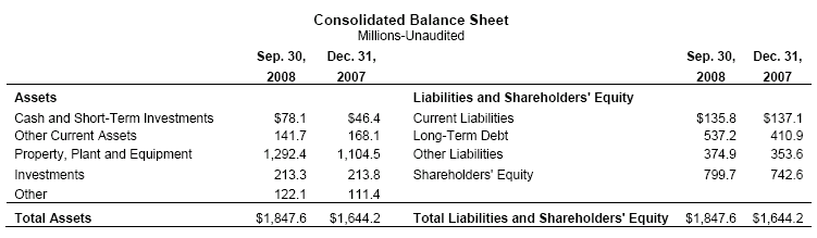 ALLETE reports third quarter results;reaffirms 2008 earnings guidance